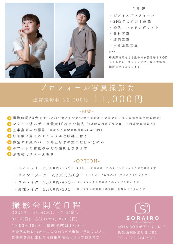 日程限定で8月に京都でプロフィール写真撮影会を行います☺︎